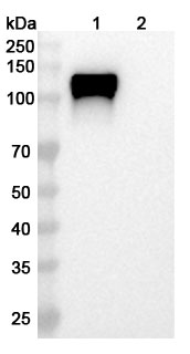 Human CD42b/GP1BA Monoclonal Antibody(ARO-A15818) was used at 1(ug/mL) concentration to detect Human CD42b/GP1BA Recombinant Protein, C-His Tag(PX-P6722) in Western Blot. The detection was compared to a negative control (lane 2).